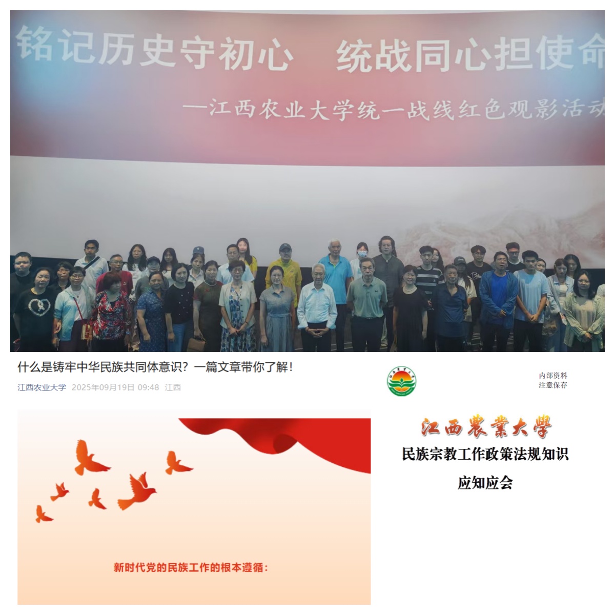 二是创新传播形式、拓展覆盖范围,在学校微信公众号推送铸牢中华民族共同体意识知识科普等内容,编发应知应会宣传手册7000余册,组织各民族师生观看红色电影,利用线上线下相结合的方式,全方位、多层次传递铸牢中华民族共同体意识理念,增强历史使命感和民族自豪感。